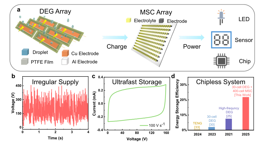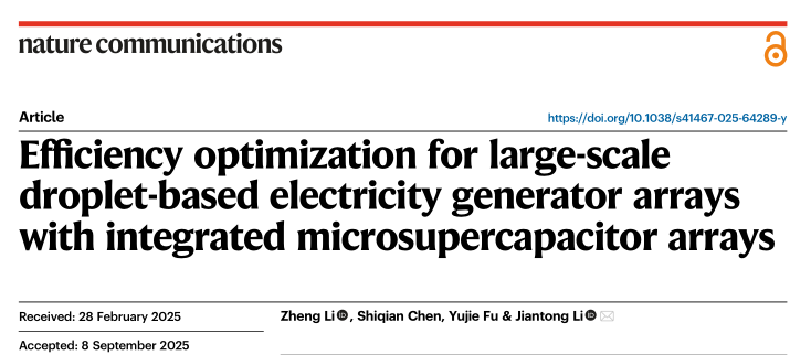 论文标题:Efficiency optimization for large-scale droplet-based electricity generator arrays with integrated microsupercapacitor arrays(基于集成微型超级电容器阵列的大型液滴基发电机阵列效率优化)