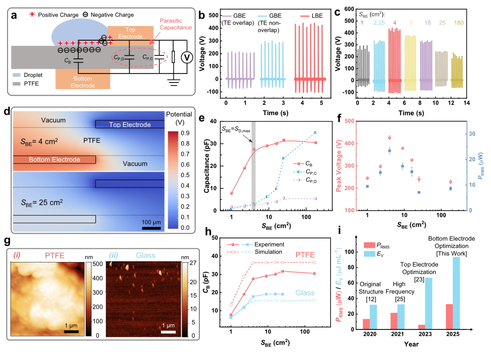 研究发现,DEG的底电极具有双重作用:足够大的底电极面积是最大化铺展水滴与底电极间体电容(C_B)、保证高输出功率的必要条件,但过大的底电极面积会显著增加电路中的寄生电容,从而降低输出功率。因此,当底电极面积与撞击水滴的最大铺展面积(S_D,max)相当时,DEG输出功率达到最大值。