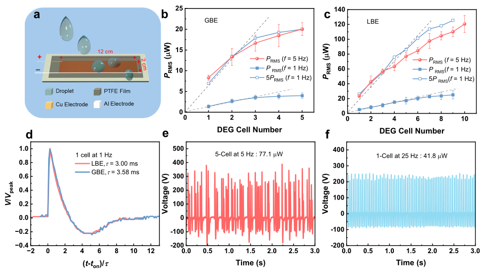 DEG利用下落的水滴撞击摩擦电聚合物,铺展的水滴能有效收集聚合物表面的摩擦电荷,产生瞬时(脉冲式)电能,其峰值功率密度可达约50 W/m²,平均功率密度约50 mW/m²。由于几乎完全由聚合物(无金属、耐腐蚀)材料制成,DEG在海洋波浪能等液压动力新兴领域具有替代传统电磁发电机的巨大潜力——海洋恶劣环境会导致金属电磁发电机严重腐蚀,大幅增加维护成本。