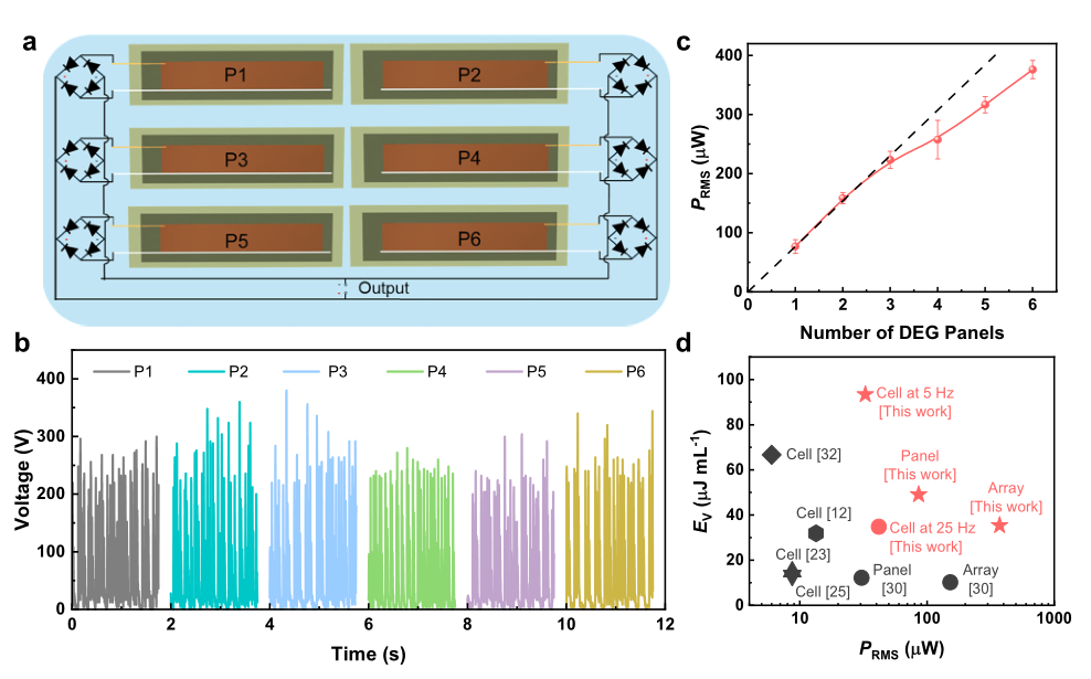 自2020年发明以来,研究人员已开发多种方法改善DEG的单元级输出性能,但目前大多数进展仅局限于调制单个DEG的输出脉冲形式,至关重要的能量收集性能指标——有效(平均)功率密度,尚未有突破原始50 mW/m²的报道。如同太阳能电池到太阳能电池板的发展,DEG实用化的关键步骤是将单个单元规模化集成,形成大型DEG面板和阵列以获取足够的总输出功率,但规模化过程面临三大关键挑战: