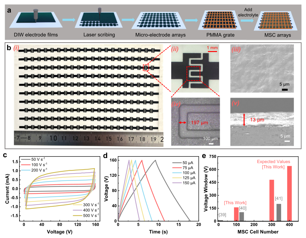 为有效存储30单元DEG阵列产生的强不规则高压脉冲电能(峰值电压>400 V),通过直接墨水书写(DIW)与激光刻蚀相结合的方法,在陶瓷基板上制备400单元MSC阵列: