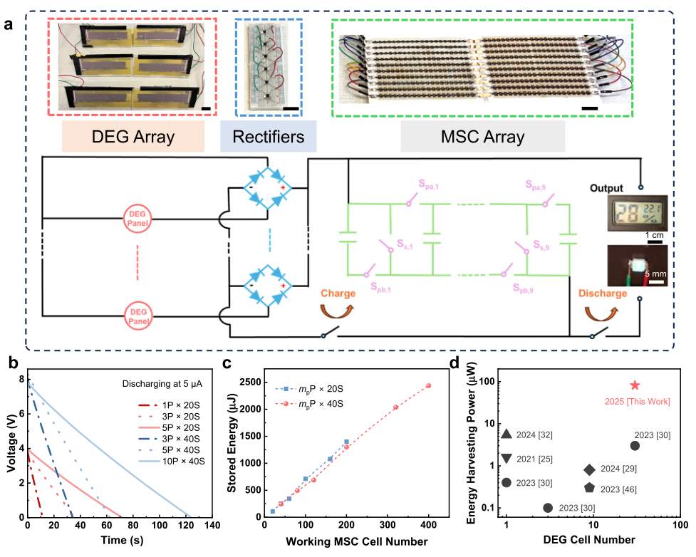 将30单元DEG阵列与400单元MSC阵列集成,构建无芯片自充电电源系统(SCPS),采用“串联充电、并联放电”策略:
