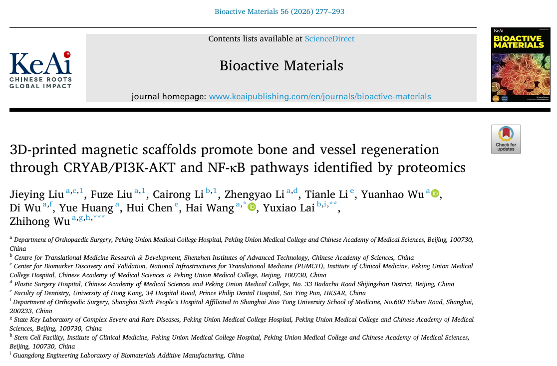 | 论文标题 | 3D-printed magnetic scaffolds promote bone and vessel regeneration through CRYAB/PI3K-AKT and NF-κB pathways identified by proteomics |