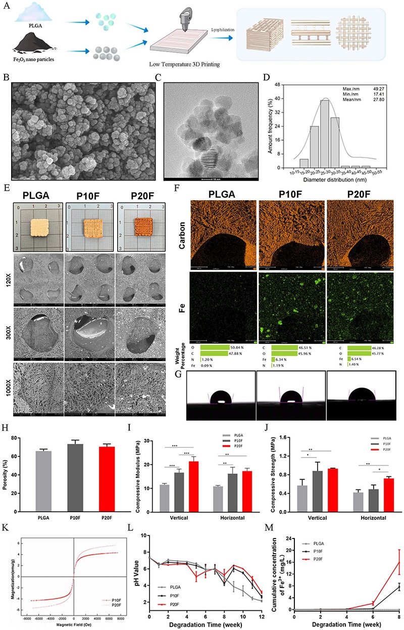 1. 成功制备了负载Fe₂O₃纳米颗粒的3D打印PLGA复合支架(PLGA、P10F、P20F、P30F),该支架具有分级多孔结构,Fe₂O₃颗粒尺寸均匀(平均约27.8nm),分散良好。随着Fe₂O₃含量增加,支架表面亲水性增强(P20F为亲水性),压缩模量和强度提高,且具有良好的超顺磁性和降解性能,在降解过程中Fe³⁺缓慢释放。