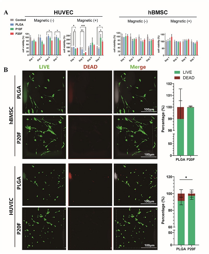 图2. PLGA/Fe₂O₃支架在有无磁场刺激下的体外细胞相容性。A:不同时间点HUVECs和BMSCs在不同支架上的细胞活力(CCK-8法);B:BMSCs和HUVECs在PLGA和P20F支架上培养3天后的活/死染色图像及定量分析(绿色:活细胞;红色:死细胞;比例尺:100μm)