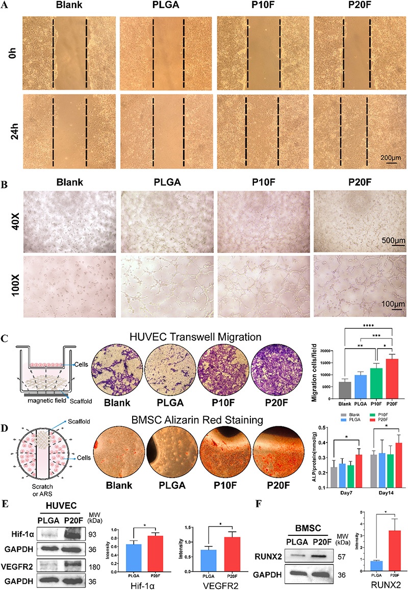 2. 体外实验表明,PLGA/Fe₂O₃支架具有优异的生物相容性,能够支持hBMSCs和HUVECs的附着、存活和增殖。在静态磁场作用下,该支架显著促进HUVECs的迁移和管形成能力,上调血管生成相关蛋白VEGFR2和HIF-1α的表达;同时,增强hBMSCs的ALP活性和钙沉积,上调成骨相关转录因子Runx2的表达,其中P20F支架表现出最优的成骨和血管生成促进效果,且IONPs本身而非单纯的Fe³⁺释放是发挥作用的关键。