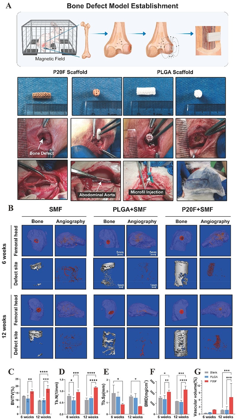 3. 体内实验中,在兔子股骨髁骨缺损模型中,P20F支架在静态磁场刺激下,显著促进新骨形成和血管再生,micro-CT分析显示其BV/TV、Tb.N、BMD显著高于对照组和PLGA组,Tb.Sp显著降低,血管体积也明显增加;组织学分析进一步证实P20F组OCN、CD31和VEGFA的表达水平最高。