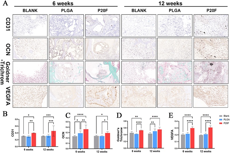 图5. 植入后6周和12周体内血管生成和成骨的组织学和免疫组织化学评估。A:空白组、PLGA组和P20F组股骨缺损部位的组织学和免疫组织化学染色图像(CD31、OCN、VEGFA染色及Goldner三色染色);B-E:6周和12周时CD31、OCN、Goldner三色染色及VEGFA免疫组织化学染色的平均光密度(MOD)定量分析