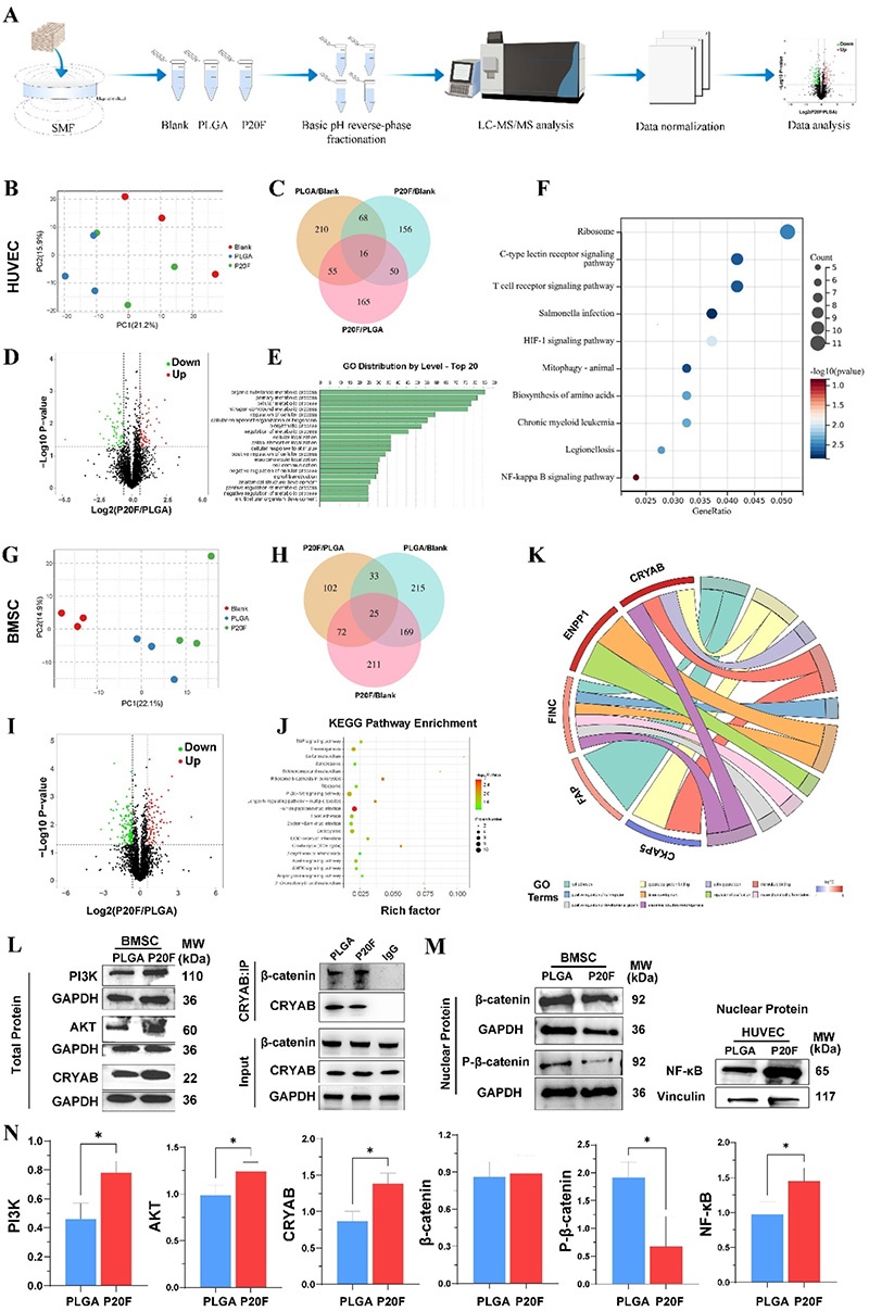 图6. 静态磁场刺激下PLGA/20%Fe₂O₃支架激活的血管生成和成骨通路的蛋白质组学分析及机制验证。A:蛋白质组学分析流程;B:HUVECs中不同组的主成分分析(PCA);C:HUVECs中差异表达基因的韦恩图;D:HUVECs中P20F与PLGA组的火山图;E:GO术语分布;F:HUVECs中KEGG通路富集分析及基因与GO术语关联;G:BMSCs中不同组的PCA;H:BMSCs中差异表达基因的韦恩图;I:BMSCs中P20F与PLGA组的火山图;J:BMSCs中GO富集分析;K:BMSCs中GO术语-蛋白质相互作用图;L:BMSCs中PI3K、AKT、CRYAB、β-连环蛋白表达的Western blot分析及Co-IP实验结果;M:BMSCs和HUVECs中相关蛋白表达的定量分析