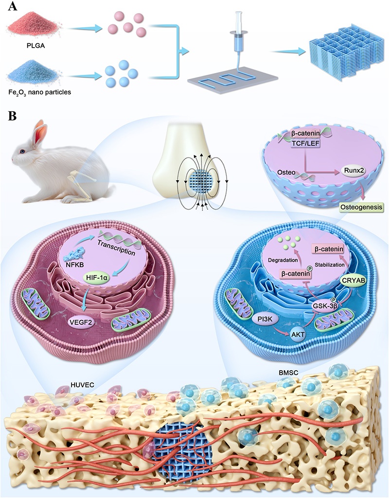 图7. 支架制备及静态磁场刺激下PLGA/Fe₂O₃支架诱导成骨和血管生成的机制示意图。A:3D打印磁性支架的制备过程;B:在静态磁场刺激下,植入的PLGA/Fe₂O₃支架在骨缺损区域同时增强血管生成和成骨的分子机制
