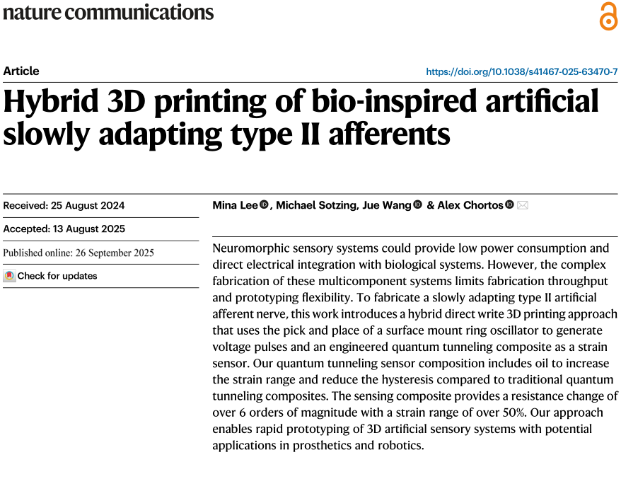 题目:Hybrid 3D printing of bio-inspired artificial slowly adapting type II afferents