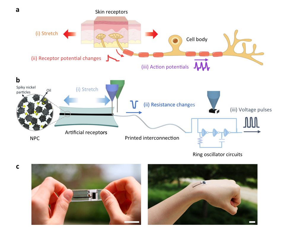 生物神经系统能以极低功耗完成高保真感知与信息处理。受启发的神经形态(neuromorphic)触觉系统,可将传感信号在本地直接转化为脉冲频率编码,实现边缘计算,并为假肢、软体机器人及生物-电子接口提供新思路。然而,现有人工传入神经(AAN)多聚焦于慢适应Ⅰ型(SA-I)受体(静态压力),对能感知皮肤拉伸、负责本体感觉的慢适应Ⅱ型(SA-II)受体报道极少;此外,多组件异质集成仍依赖手工,制造通量低、可重复性差。因此,亟需开发可拉伸、低迟滞、电阻变化跨 6 个量级的 SA-II 受体材料,并与振荡电路一体化,实现自动化、可快速原型化的三维人工传入神经。