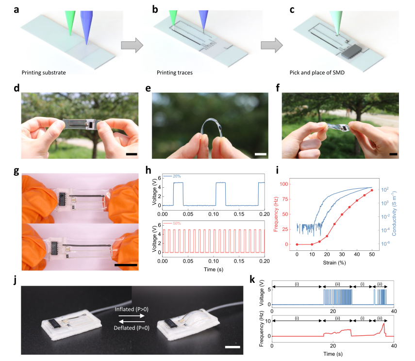 本研究提出“混合 3D 打印”策略:在单一平台上完成多材料直写与贴片封装,将高性能硅基环形振荡器与可拉伸负阻复合材料(NPC)异构集成,制备出仿生 SA-II 人工传入神经。