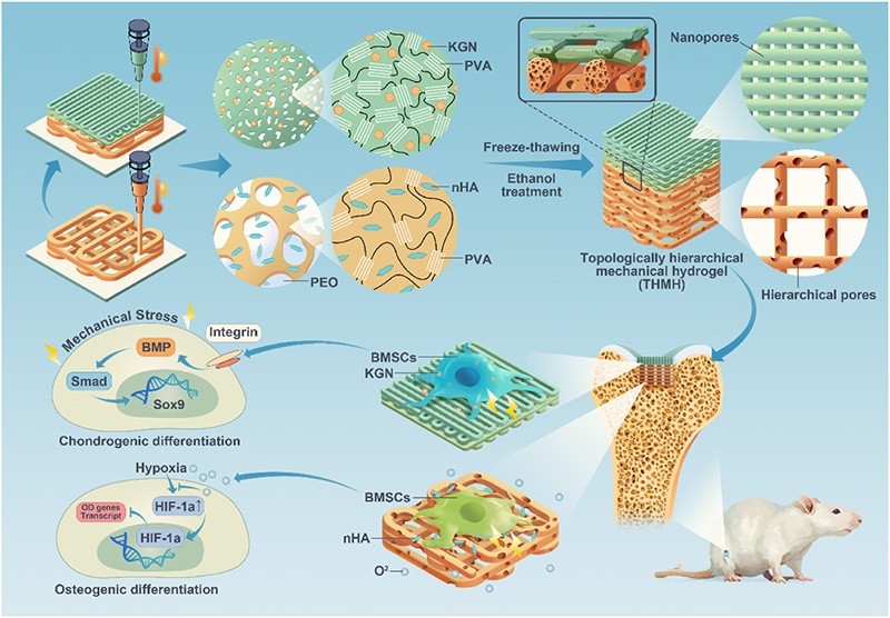本研究开发了一种拓扑分层机械水凝胶(THMH)支架,采用集成3D打印技术,具有仿生双层结构,能够模拟天然骨软骨微环境。该支架整合了纳米多孔软骨模拟层和大孔成骨层,通过梯度孔隙相互连接,以促进营养物质运输、血管形成和细胞间通讯。