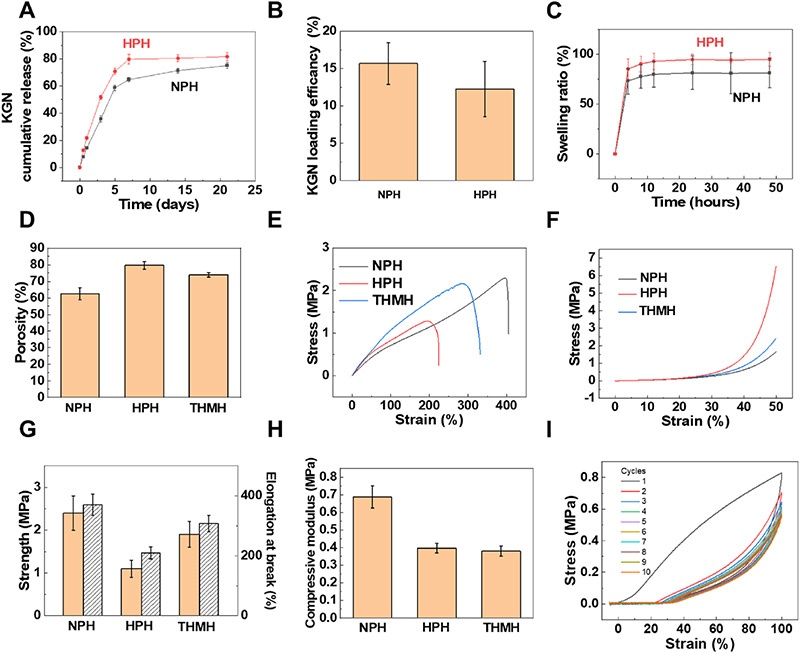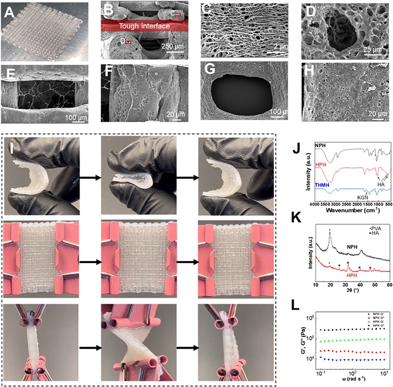 3. 3D打印过程:使用自制3D打印机(喷嘴直径250μm)打印NPH、HPH和THMH支架。THMH支架经一步冻融循环(-20℃ 6小时,25℃ 4小时)和75%乙醇处理2小时,去除PEO和过量甘油,得到最终支架。