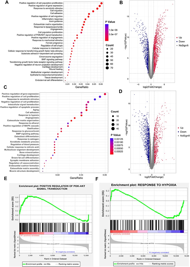 3. 转录组分析:NPH组差异表达基因富集于机械刺激响应、细胞增殖迁移粘附正调控、细胞外基质组织及PI3K-AKT信号通路,提示其通过力学性能和KGN激活整合素-PI3K-AKT信号轴促进成软骨分化;HPH组差异表达基因富集于细胞粘附增殖、细胞外基质组织、缺氧响应及BMP信号通路,其层级多孔结构改善了内部缺氧环境,促进成骨分化。