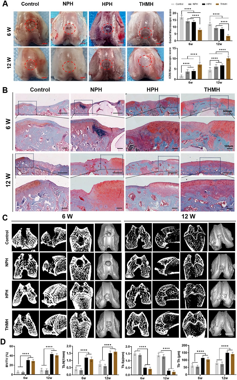 THMH的纳米多孔软骨模拟层通过力学性能和KGN激活整合素-PI3K-AKT信号轴,促进BMSCs成软骨分化并抑制软骨肥大分化;大孔成骨层则通过层级多孔结构改善内部缺氧环境,促进BMSCs成骨分化。体内外实验证实,THMH具有优异的生物相容性、力学性能和骨软骨再生能力,在大鼠骨软骨缺损模型中实现了近乎完全的骨软骨再生。