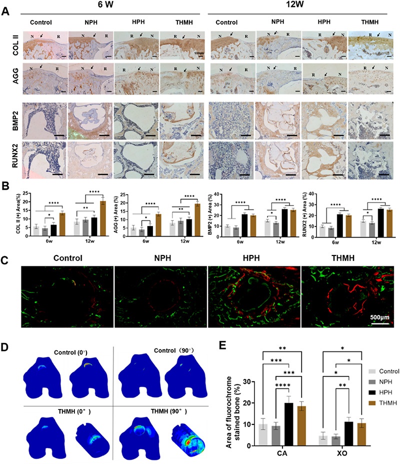 6. 动物实验:将64只6-8周龄雄性SD大鼠随机分为4组(NPH、HPH、THMH和空白组),在股骨髁建立骨软骨缺损模型(直径2mm×深度3mm),植入相应支架或不做处理。术后6周和12周处死大鼠,通过大体观察、Micro-CT扫描、组织学染色(HE、番红O-固绿、免疫组织化学、免疫荧光染色)、序列荧光染色等评估骨软骨修复效果;进行有限元分析评估生物力学性能;检测主要器官组织评估体内生物相容性。