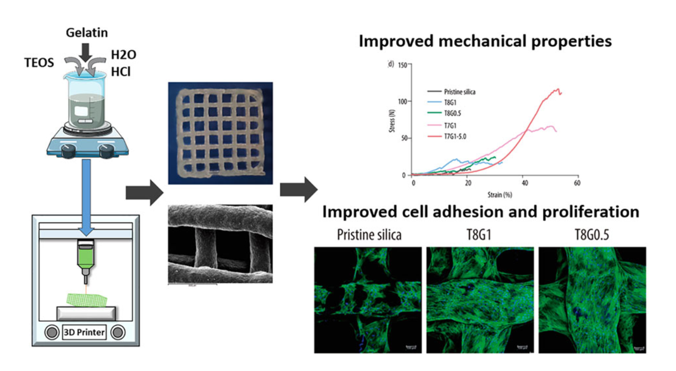 近期,具有无机和有机组分共网络结构的3D打印杂化墨水被认为是克服硅基复合材料缺陷的有效途径。这类硅杂化材料通常在温和温度下通过溶胶-凝胶反应制备,即硅前驱体先水解,再通过温度或pH值调节进行凝胶化。但目前通过该方法制备的硅基杂化材料所使用的聚合物缺乏对细胞黏附至关重要的RGD序列。因此,使用含RGD序列的明胶作为聚合物,有望增强骨再生效果。为实现明胶与硅网络的化学结合,3-缩水甘油氧基丙基三甲氧基硅烷(GPTMS)已被用作交联剂,与正硅酸乙酯(TEOS)作为主要硅前驱体配合使用。不过,此前相关研究的配方中明胶占比高于硅,这可能限制支架在骨再生应用中的生物活性。基于上述研究现状,本研究旨在开发一种硅含量高于聚合物的硅-明胶杂化墨水,以充分发挥硅的生物活性和血管生成特性。