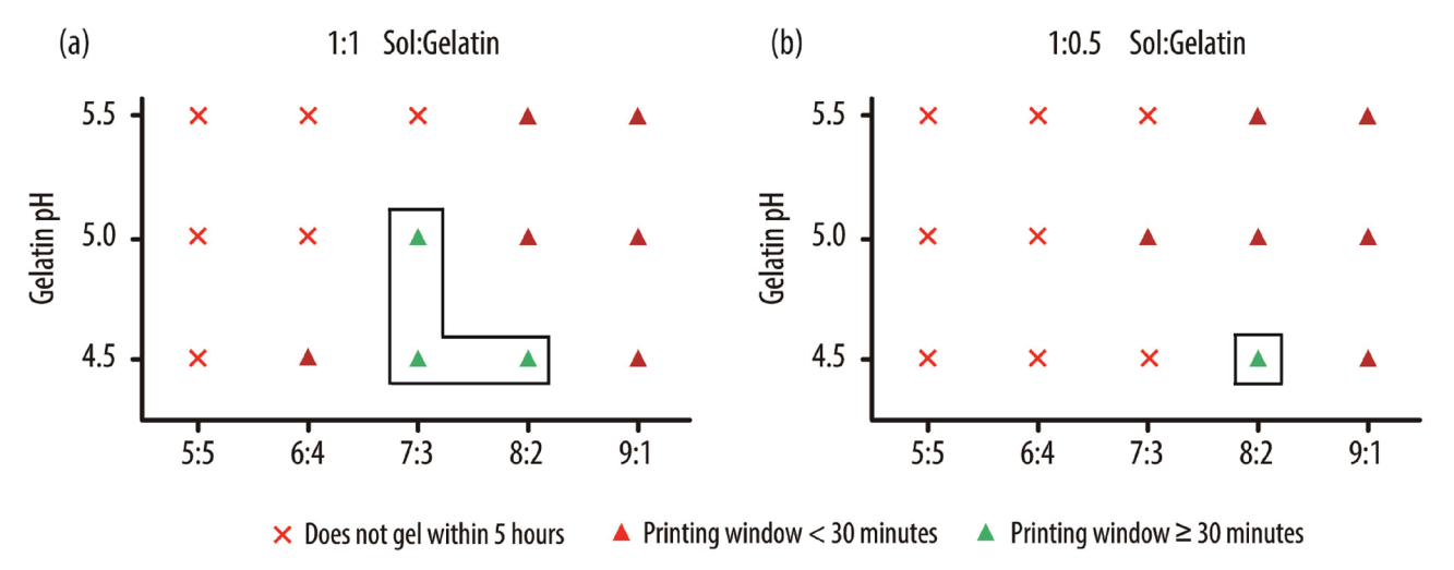 1. 墨水研发结果:在35°C下进行溶胶-凝胶反应以维持明胶液态,GPTMS浓度限制在硅前驱体的50%以内(考虑其潜在细胞毒性)。通过筛选不同配方,获得四种可打印墨水:T8G1、T8G0.5、T7G1和T7G1-5.0,其中前三者pH为4.5,T7G1-5.0 pH为5.0,TEOS:GPTMS比例在7:3–8:2之间,明胶与溶胶比例分别为1:1或0.5:1。