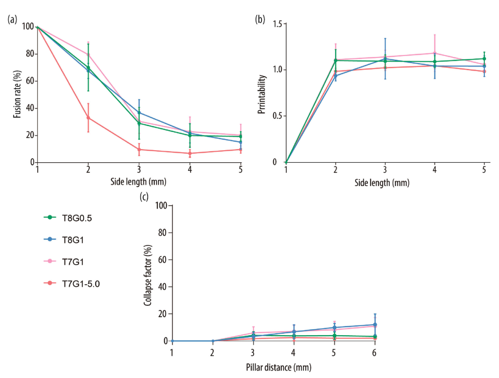 3. 形状保真度与收缩率测试:依据既定方案进行融合率(Dfr)、可打印性(Pr)和坍塌率(C)测试,并对比支柱宽度与理论值。使用Direct-Writing 3D打印机(Bio X, Cellink),打印速度4 mm/s,挤出速度2.50 µl/s,喷嘴直径0.58 mm。形状保真度测试做五组重复,支柱宽度测试做三组重复。