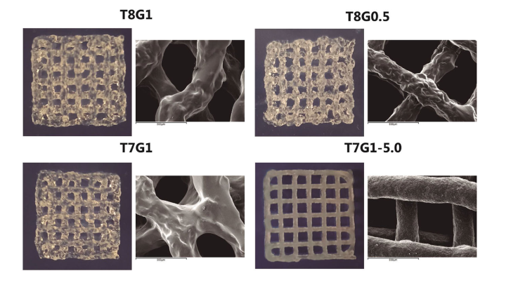 3. 支架3D打印效果:所有打印支架呈白色半透明状,T7G1-5.0为均匀白色且不透明;T7G1-5.0的支柱均匀呈圆柱形,其他三种墨水的支柱长度方向宽度不均,呈锯齿状路径;SEM图像显示T7G1-5.0表面粗糙,其他三种表面较光滑且因支柱不均匀存在可见褶皱。