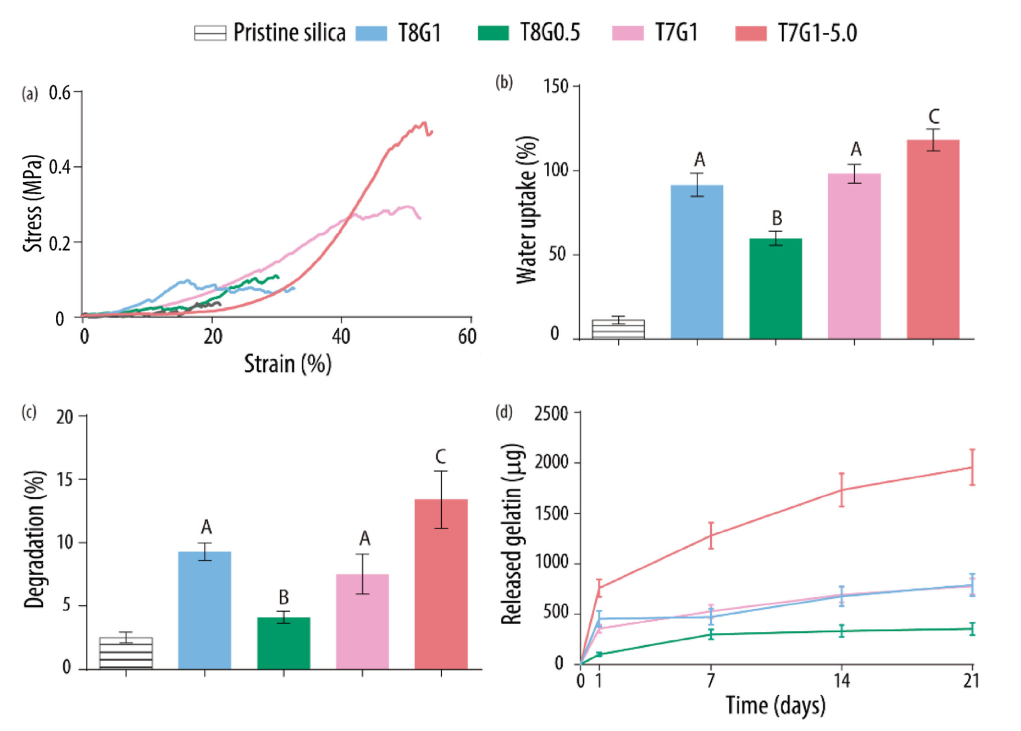 4. 力学性能:纯硅支架力学性能较低,应力-应变曲线呈锯齿状(压缩过程中存在微断裂);杂化墨水支架的脆性降低,所有杂化墨水的极限拉伸强度显著提高(p<0.05),明胶和GPTMS含量较高的墨水破坏应变更大(p<0.05)。T8系列配方应力较高,但仍保留锯齿状曲线;T7系列(尤其是T7G1-5.0)应力-应变曲线呈线性响应,弹性区域更大,塑性行为更显著,应力和变形能力显著提高,推测与更高的交联剂含量及pH 5.0更利于明胶交联有关。