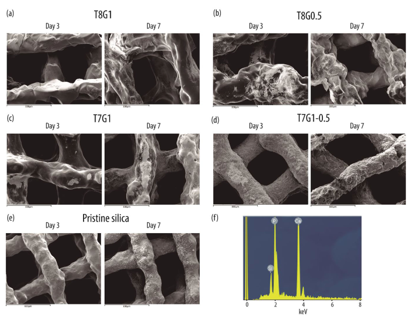 6. 体外磷灰石形成:纯硅支架和T8G1在SBF中浸泡7天后开始沉积磷灰石,其他三种杂化支架3天即开始沉积,7天几乎完全覆盖;EDS分析证实沉积物含钙和磷离子。较高明胶含量延迟磷灰石沉积,GPTMS可能对磷灰石形成有积极作用。