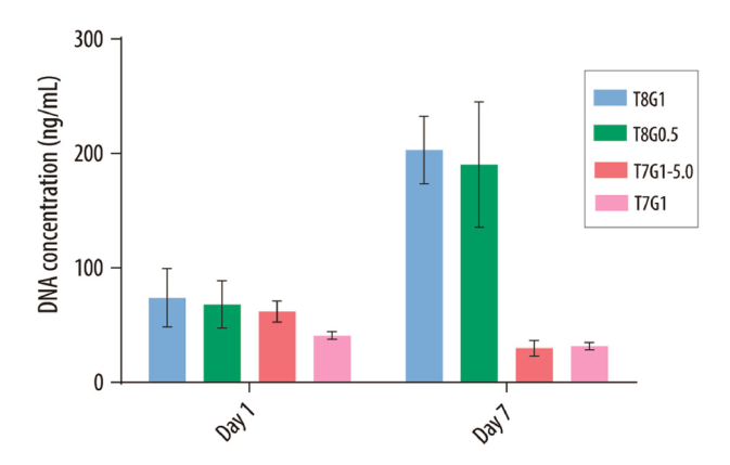 在生物响应方面,GPTMS含量较高的T7G1和T7G1-5.0因潜在的GPTMS相关毒性,无法支持细胞增殖;而T8G1和T8G0.5能有效促进细胞增殖,增强初始细胞黏附,7天后细胞数量较纯硅支架接近三倍。