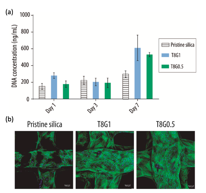 8. 体外3D增殖与免疫组织化学:T8G1的初始细胞黏附显著高于纯硅支架(p<0.05),T8G0.5与纯硅无显著差异;第7天所有组细胞数量均显著增加,纯硅支架细胞数量翻倍,杂化支架增至三倍。免疫荧光图像显示杂化支架细胞覆盖率更高,细胞分布均匀且形态扁平、有多个细胞骨架延伸,表明细胞与支架结合牢固。