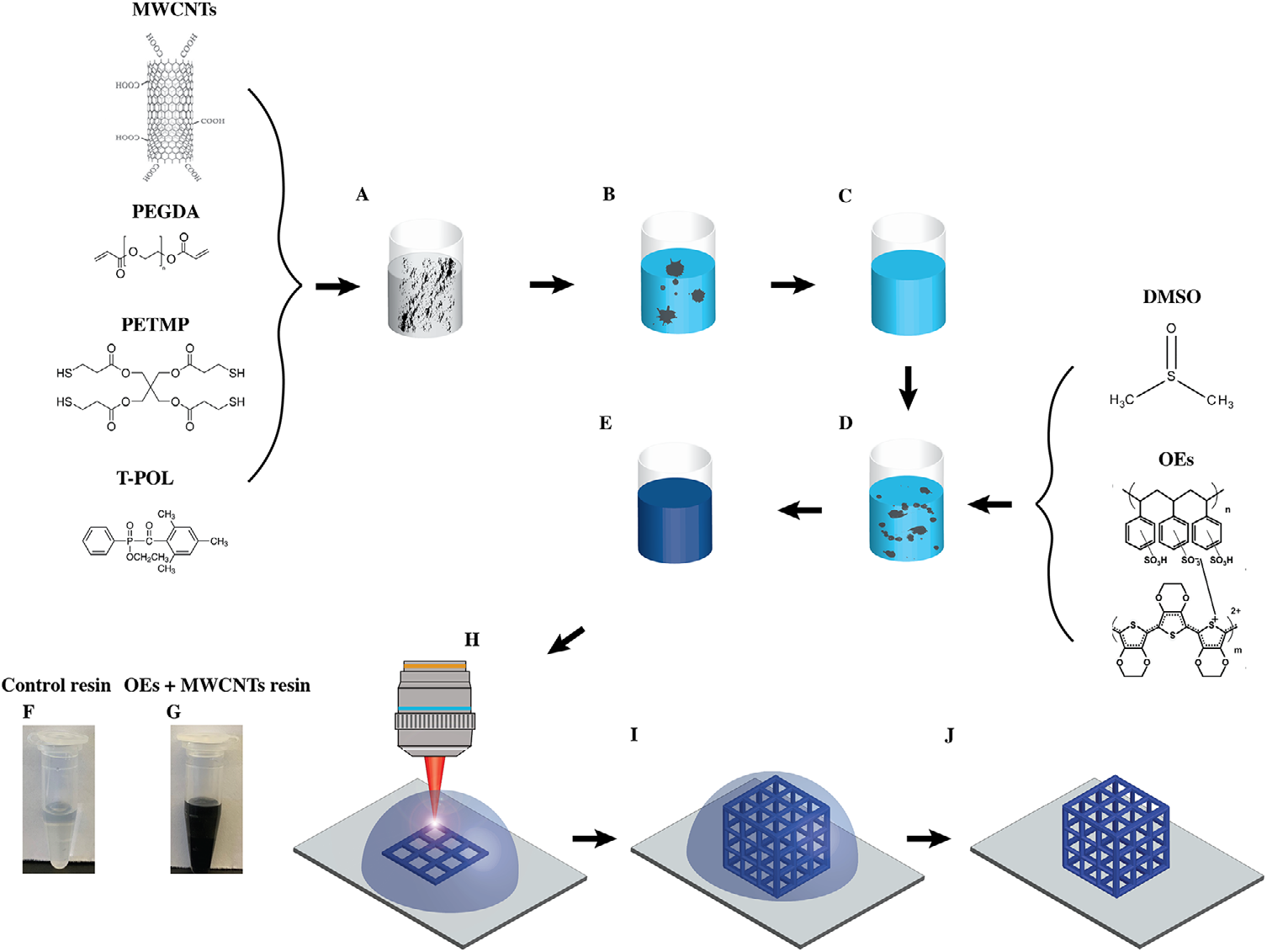 本研究聚焦软可拉伸电子器件的多材料 3D 打印技术,针对双光子聚合(2PP)制备导电材料时导电性、透明度与结构分辨率难以兼顾的问题,开发了集成 PEDOT:PSS(OE)和多壁碳纳米管(MWCNTs)的新型复合树脂。该树脂在 0.4 wt.% OE 与 0.15 ...
