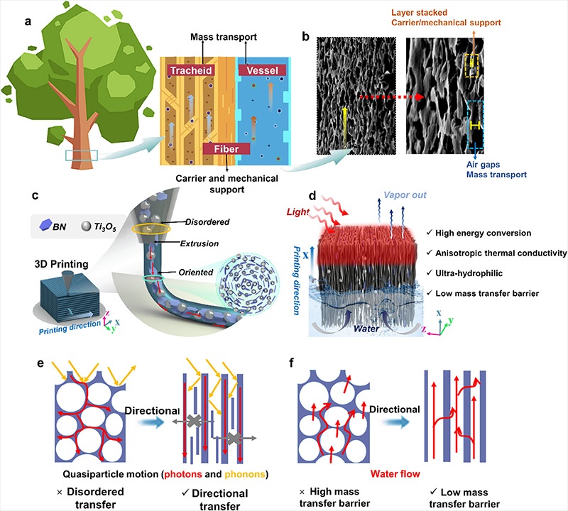 本研究借助 3D 打印技术,制备出集成 Ti₃O₅纳米颗粒、BN 纳米片与壳聚糖的各向异性通道蒸发器(a-BTCG),通过打印剪切场实现 BN 定向排列,构建几何 + 材料双各向异性结构。该器件实现宽谱光捕获、定向热传导与低焓水蒸发的协同作用,...