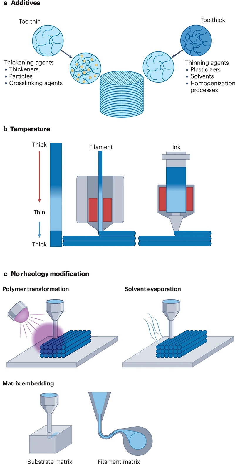 图2 | 材料可打印性及改性。a. 低粘度(稀薄)牛顿流体可通过添加增稠剂、颗粒或交联剂来增加粘度并诱导剪切变稀特性,从而实现可打印性;相反,高粘度(粘稠)材料可通过加入增塑剂、溶剂或采用均化工艺实现可打印性。b. 温度调节可用于熔化或软化固体材料,或降低粘稠墨水的粘度,使其可挤出。c. 并非总是需要流变改性;墨水可通过紫外线交联或前沿聚合等聚合物转化,或通过溶剂蒸发,在挤出后保持形状。此外,基质材料(如基底或细丝基质)可支撑墨水,保持其打印结构。