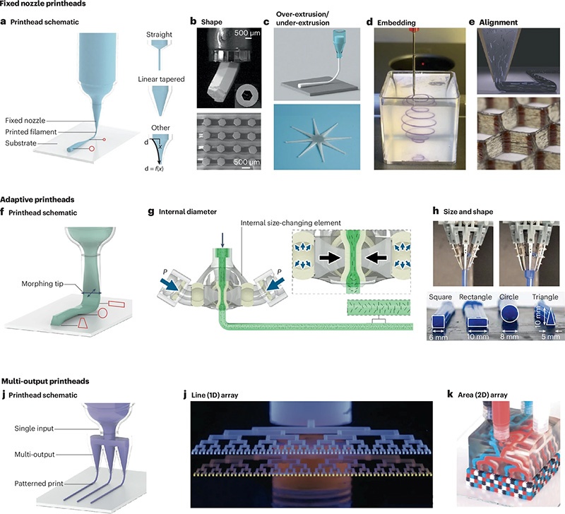 图3 | 形状调制喷头。a. 固定喷嘴喷头示意图;b. 可切换喷嘴出口形状的喷头及所得长丝横截面;c. 通过固定喷嘴中的流量调节控制长丝直径,以及在打印星形结构中产生的梯度;d. 在牺牲水凝胶基质内的自由形式嵌入式3D打印;e. 环氧树脂基质中短碳纤维的剪切应力取向,在蜂窝状打印结构中得到展示;f. 具有尺寸变化和形状变化能力的自适应喷头示意图;g. 内径调节实现径向颗粒排列(P表示输入压力);h. 自适应喷嘴展示小(左)和大(右)出口直径,以及示例性打印横截面;i. 单材料输入的多输出喷头示意图;j. 用于周期性多孔结构的多输出喷嘴阵列;k. 固体和多孔结构的体素化多材料打印。图b经Wiley许可改编自参考文献100;图c转载自参考文献105(CC BY 4.0);图d转载自参考文献249(CC BY 4.0);图e经Wiley许可转载自参考文献28;图g经Wiley许可改编自参考文献127;图h经AAAS许可改编自参考文献128;图j经Wiley许可转载自参考文献134;图k经Springer Nature Limited许可改编自参考文献38。