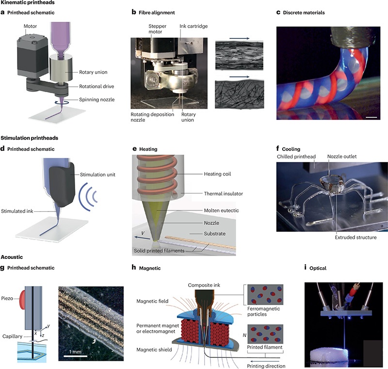 • 运动学喷头:通过旋转或平移运动,实现各向异性特征的精确对齐,提高可打印性。旋转喷嘴实现螺旋纤维排列,增强结构性能;平移振动可修改材料流变学特性或防止喷嘴堵塞。