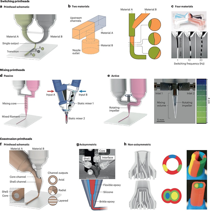 图5 | 多材料喷头。a. 基本切换喷嘴示意图;b. 双输入单输出T型接头喷嘴(左,增大输出直径以减少材料过渡长度)和Y型接头切换喷嘴(右,设计用于将生物墨水组合成具有特定多材料横截面的打印材料);c. 四输入或多输入单输出切换喷嘴,用于体素化物质打印;d. 基本被动混合喷嘴示意图(左)和用于创建可调局部刚度的被动混合喷嘴图片(右);e. 主动混合喷嘴示意图(左)和主动混合喷嘴及所得功能梯度材料图片(右);f. 具有轴向、径向或层状通道输出的共挤出喷头示意图;g. 内通道缩回的多核-壳喷嘴,以最小化出口直径;h. 用于先进共挤出图案的计算设计分段喷嘴。图b左经Wiley许可转载自参考文献169;图b右经ASME International许可转载自参考文献171;图c经Springer Nature Limited改编自参考文献38;图d右经Wiley许可改编自参考文献40;图e右经PNAS许可改编自参考文献172;图g经Wiley许可转载自参考文献41;图h改编自参考文献225(CC BY 4.0)。