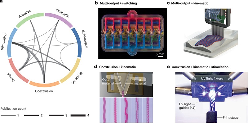 图6 | 混合喷头。a. 最新进展表明,最多可集成四种专用喷头类型。注:该图不包括涉及固定喷嘴的组合。文献中的喷头模块组合:自适应+混合、自适应+共挤出、切换+多输出、激励+运动学等。b. 多输出喷嘴阵列与八材料多材料切换喷嘴的模块化集成;c. 利用运动学多输出喷嘴进行周期性结构的共形打印;d. 具有平移内芯的共挤出喷嘴,用于动态横截面形状;e. 多材料介电弹性体执行器,通过共挤出和旋转运动学喷头形成,并辅以集成紫外线固化。图b经Springer Nature Limited改编自参考文献38;图c经Wiley许可改编自参考文献136;图d经Wiley许可转载自参考文献231;图e经Springer Nature Limited改编自参考文献42。