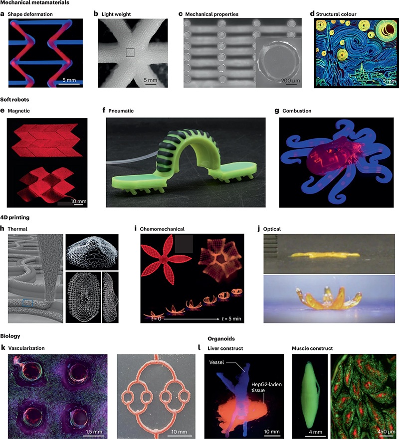 将多种喷头功能与先进材料相结合,催生了广泛的新兴应用,包括机械超材料、软机器人、4D打印和生物系统等领域。