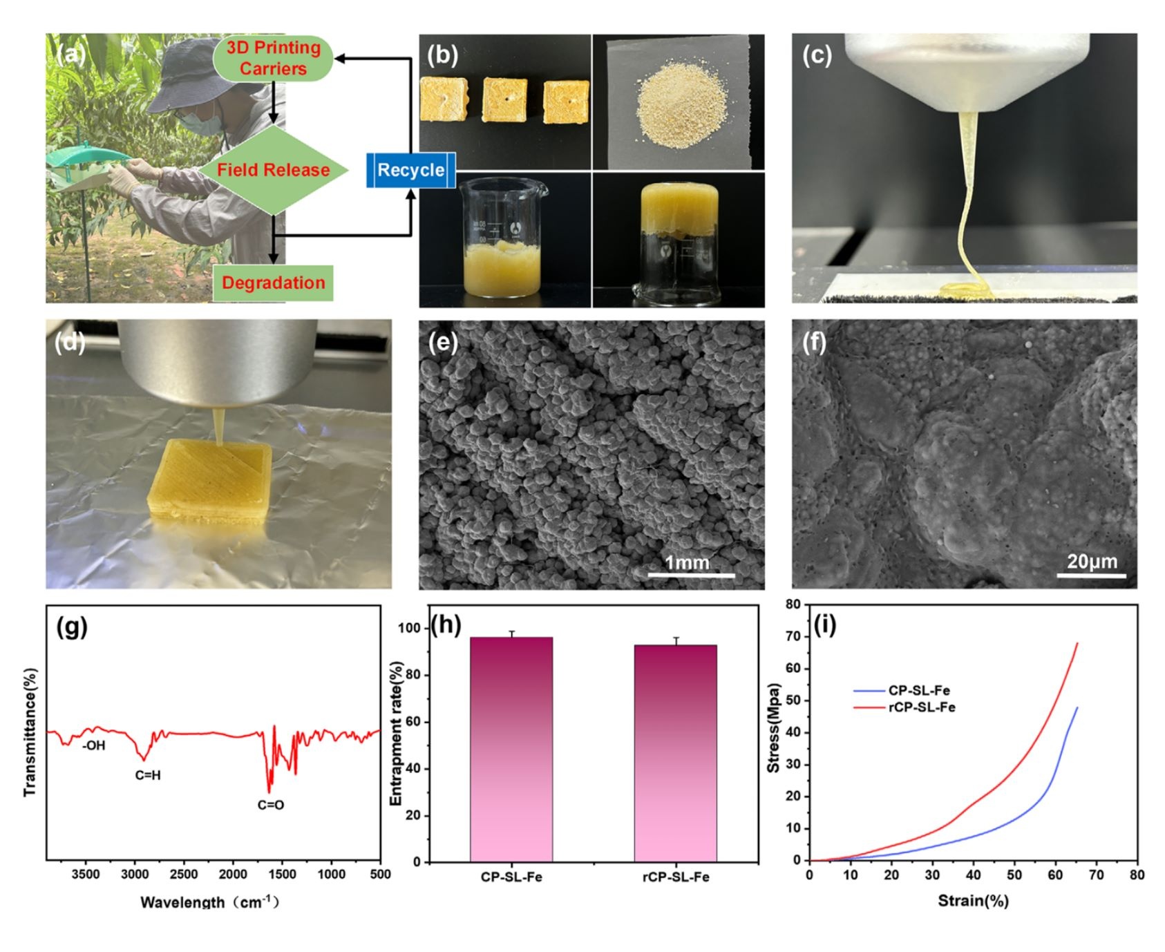 研究了3D打印载体的可回收性和再利用性能。通过物理研磨、有机溶剂溶解和信息素补充,成功回收并再打印了CP-SL-Fe载体。回收后的载体(rCP-SL-Fe)保持了良好的物理和化学性质,封装效率和生物活性未显著下降,显示出优异的可回收性和再利用潜力。
