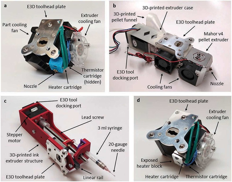 图1 多模态多材料挤出系统的工具头:(a)E3D Hemera丝材挤出头;(b)适配E3D换刀系统的Mahor v4颗粒挤出头(含3D打印定制外壳);(c)定制油墨挤出头(注射器泵);(d)油墨固化加热器