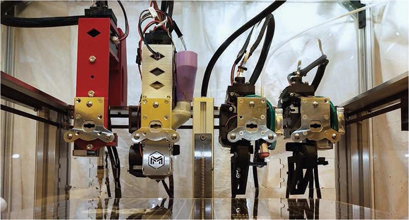 图3 系统最终工具头布局(从左到右:油墨挤出头、颗粒挤出头、丝材挤出头、加热器)