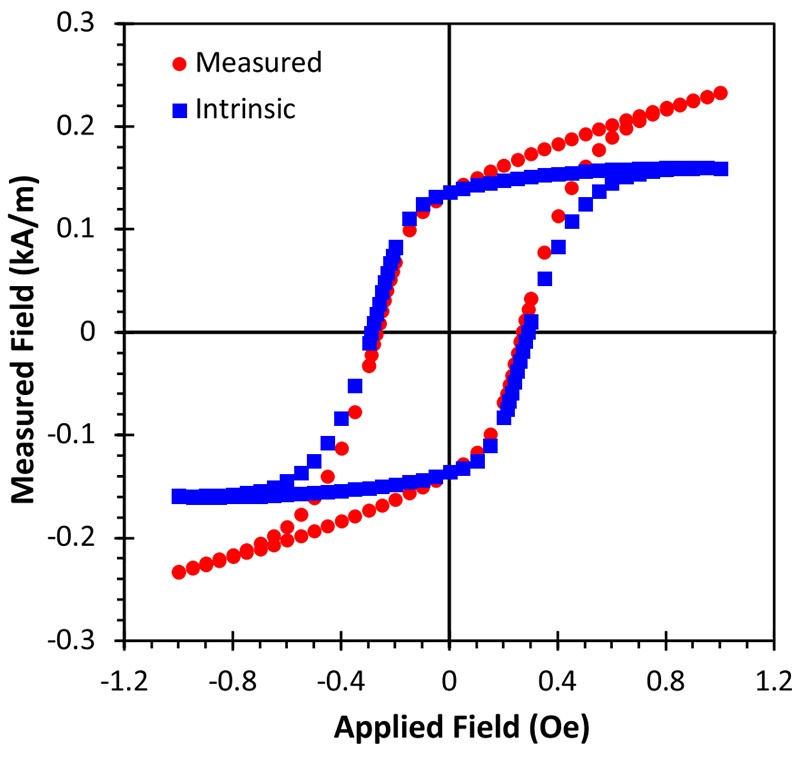 图6 锶铁氧体掺杂尼龙硬磁复合材料的磁滞回线(实测曲线+本征曲线,修正退磁因子N≈0.07)