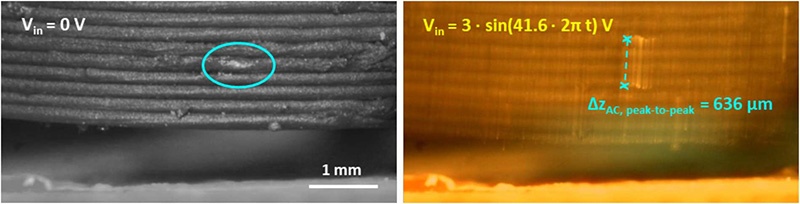 图21 共振频率下电机的峰值位移:Vin=0V(左,灰度)、Vin=3-sin(41.6×2πt)V(右),峰峰值位移636μm(Δz_AC=318μm)