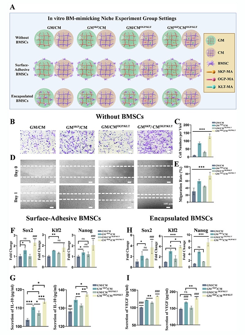 本研究通过一系列体外实验验证了骨髓模拟微环境的生物相容性、干细胞募集/干性维持、血管生成、免疫调节和成骨分化能力,核心结果如下: