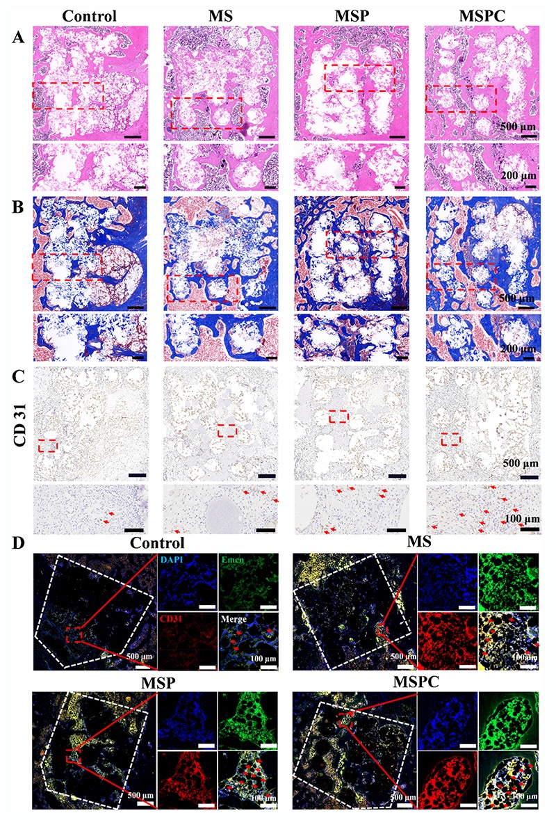 构建大鼠股骨髁3mm×3mm×4mm临界骨缺损模型,设置四组实验:①对照组(仅3D打印支架);②MS组(支架负载GM/CM微球,无肽);③MSP组(支架负载GM-SKP/CM-OGP/KLT微球,无外源性BMSCs);④MSPC组(支架负载GM-SKP/CM-OGP/KLT微球,负载外源性BMSCs),通过免疫组织化学、Micro-CT、组织学染色验证骨再生效果。