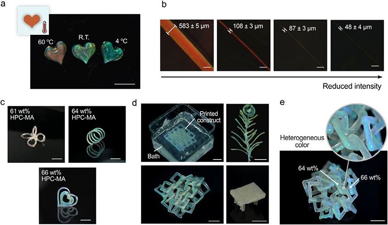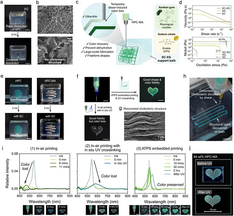 采用SC-XG食品级支撑浴,利用直写式(DIW)3D打印机实现HPC嵌入式打印,挤出后在浴中恢复胆甾相与结构色,可制备>10 cm结构,分辨率~50 μm。