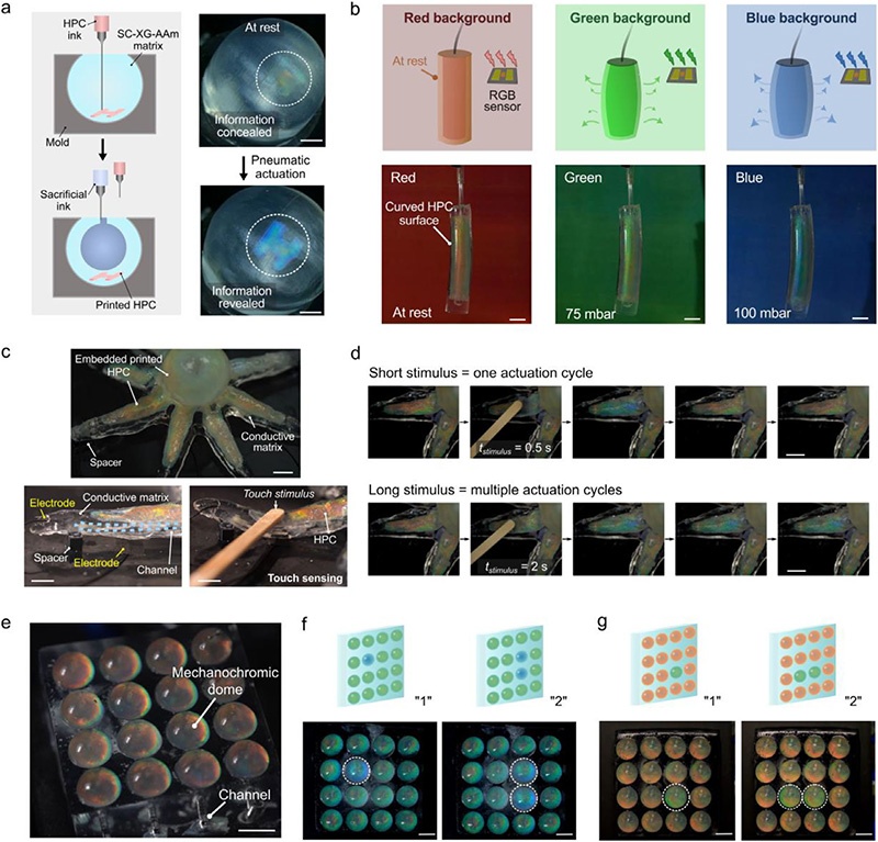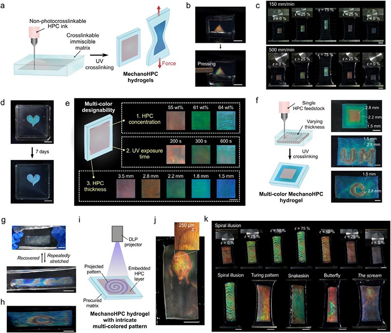 将HPC打印至可交联水凝胶基体,拉伸/压缩时红→蓝连续变色,可通过浓度、厚度、UV时间编程多色,结合DLP实现高精度图案。
