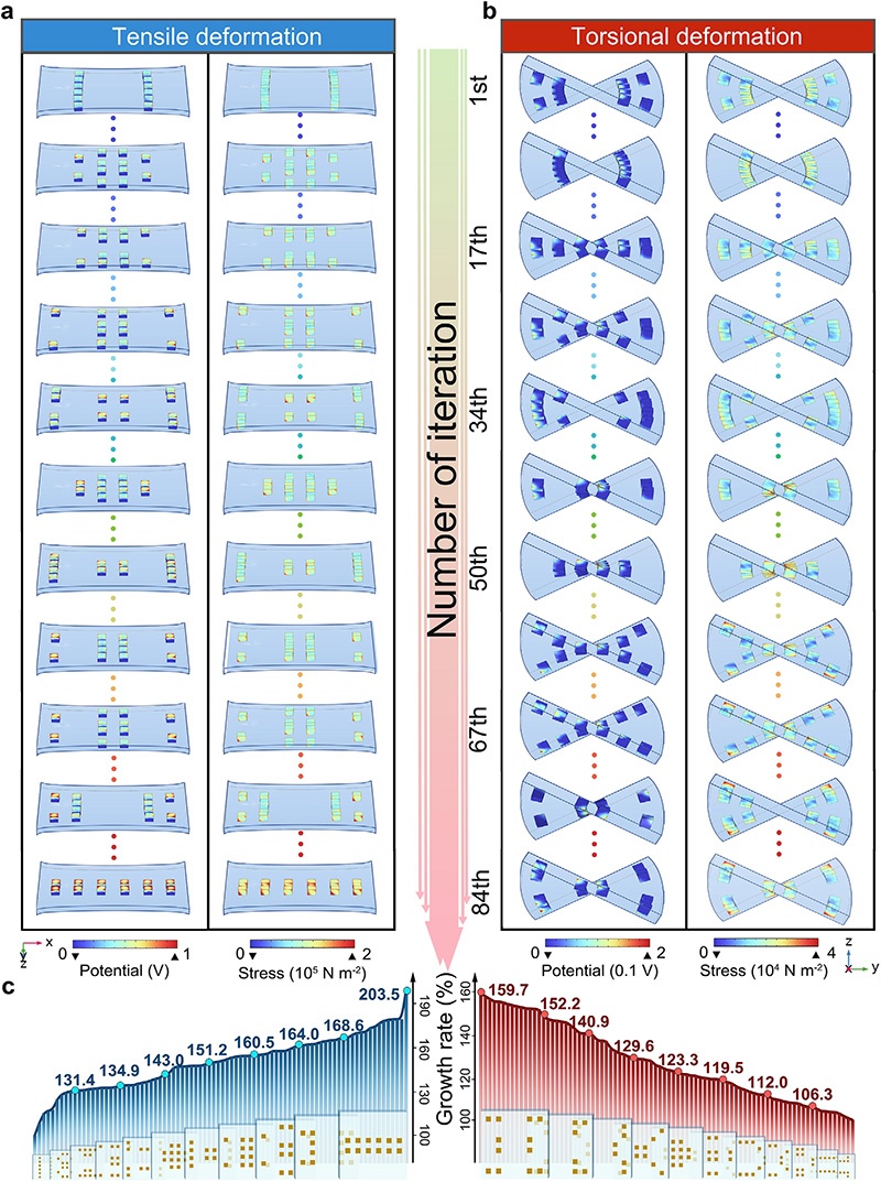 采用计算机辅助拓扑优化+有限元分析,针对拉伸、扭转两种各向异性形变,对多孔PZT压电陶瓷在Ecoflex基体中的排布进行84组迭代优化。