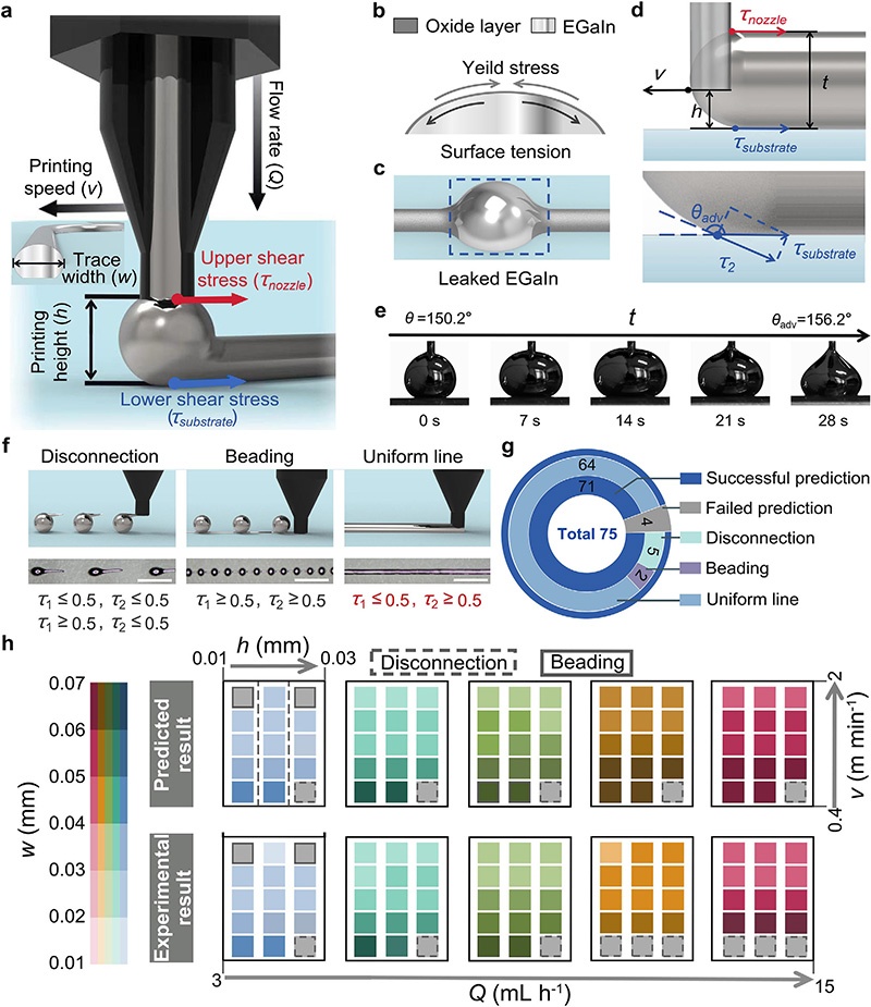 打印参数:挤出速度、打印速度、打印高度协同调控;EGaIn氧化层维持形貌,临界剪切应力决定打印连续性。
