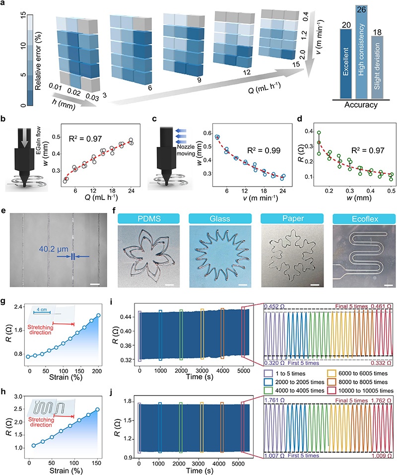 开发直写式(DIW)3D打印工艺,建立剪切驱动打印理论模型,精准预测打印状态(准确率94.7%)与线宽(误差<15%)。